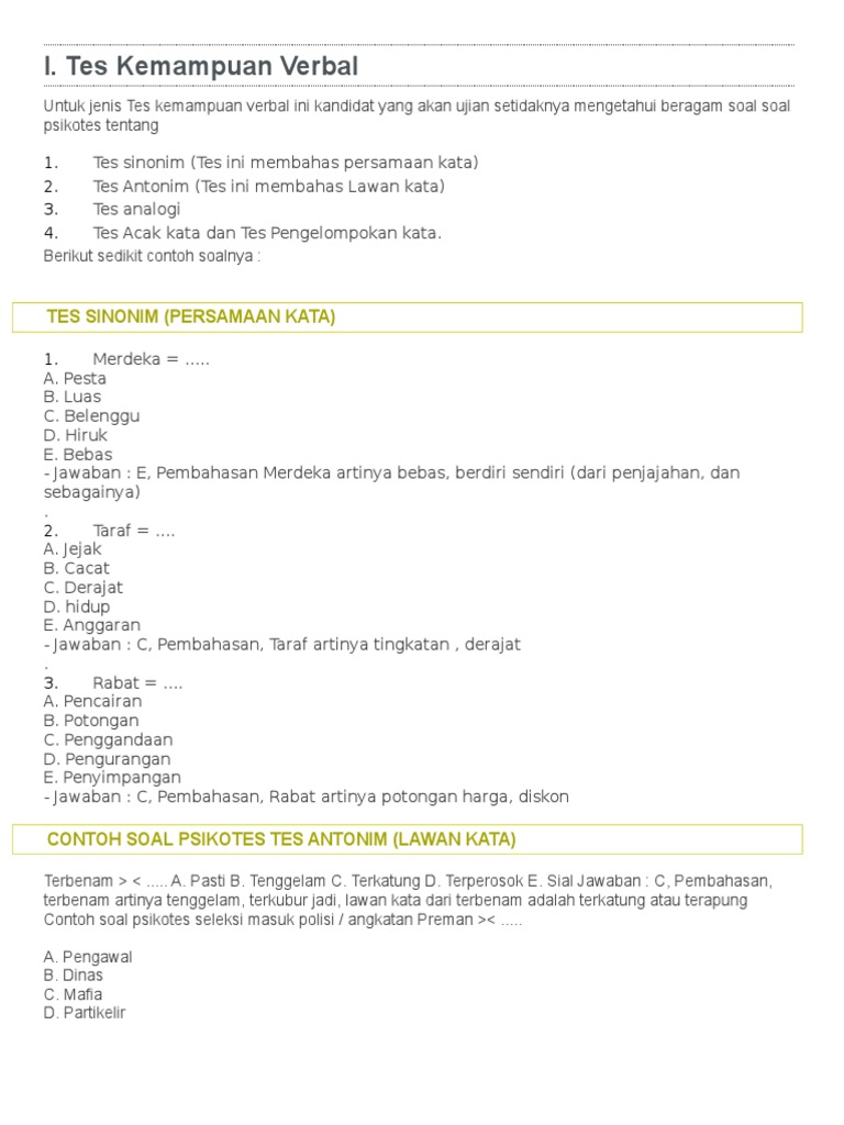 Tes kemampuan verbal ini meliputi sinonim (persamaan kata), antonim (lawan kata), analogi dan contoh jawaban tes psikotes menggambar orang oelamasinews.com. Sinonim adalah salah satu jenis soal yang ada dalam ujian cpns psikotes dan tpa. Tes ini digunakan untuk meningkatkan 1.2 contoh soal psikotes antonim (lawan kata). Tes ini mencakup soal tentang sinonim (persamaan kata), antonim (lawan kata), analogi dan kolerasi makna. Pengertian dari antonim dan sinonim adalah sebagai berikut :