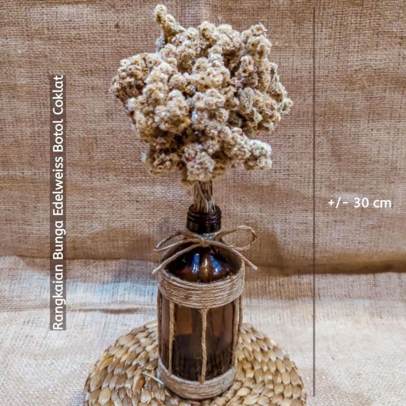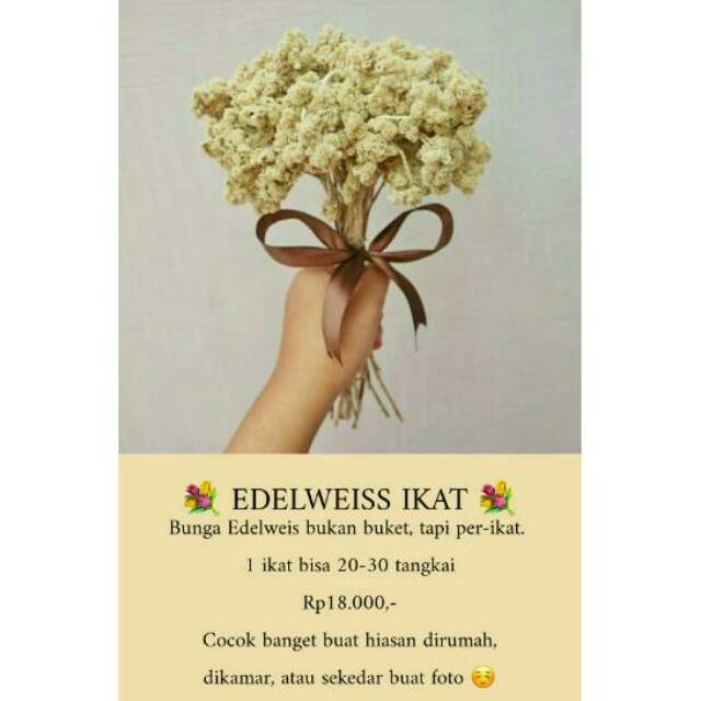 Bunga edelweis lama dikenal dengan julukan bunga abadi. Rangkaian bunga edelweiss ini cocok sebagai hiasan tempat bisnis sehingga menimbulkan suasana yang rileks, santai, dan nyaman. Bunga edelweis jenis ini merupakan bunga edelweis yang biasa di temukan oleh sejumlah pendaki gunung indonesia. Bunga edelweis bromo dijual dengan harga yang beragam muali dari 10rb hingga 50rb. Tanpa air dan udara kau jadi hiasan di rumahku.